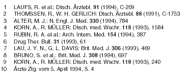 THERAPIE: Zur Behandlung steht nur Interferon alfa (IFNα; INTRON A, für ROFERON-A keine zugelassene Indikation) zur Verfügung.6 Die Therapie mit dem Virustatikum Ribavirin (VIRAZOLE) wird gegenwärtig erprobt.7 Interferone regen Zellen des Abwehrsystems an, Eiweiße zu bilden, die die Virusvermehrung stören.5 Nach 13 randomisierten, kontrollierten Studien normalisieren 1, 2 bzw. 3 Millionen Einheiten (MU) IFNα subkutan dreimal wöchentlich über sechs Monate die Transaminasen bei 27%, 33% bzw. 41% der Patienten mit chronischer Non-A-Non-B-Hepatitis, verglichen mit 2,6% in unbehandelten Gruppen.7 Nach vier Untersuchungen bessert sich die Leberhistologie bei über der Hälfte derjenigen, die 3 MU INFα erhielten, nicht aber unter 1 MU oder Plazebo. Bei 50% bis 80% der Patienten steigen die Leberenzyme nach Absetzen erneut an. Sie können mit weiteren Injektionen wieder gesenkt werden. Virus-Genotyp 1b und anhaltend hohe Titer auch unter der Therapie sollen gegen einen voraussichtlichen Behandlungserfolg sprechen.10 Ob INFα HCV aus dem Blut entfernt oder das Fortschreiten einer chronischen Entzündung zur Zirrhose verlangsamt, ist noch ungewiß.6