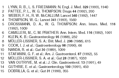 Eine 1988 vorgenommene Auswertung von 43 kontrollierten, randomisierten und doppelblind durchgeführten Arzneimittelstudien beim Reizdarmsyndrom umfaßt so verschiedenartige Mittel wie Spasmolytika (12 Studien), Ballaststoffe (6), Antidepressiva (5), Tranquilizer (4), Anticholinergika (3), Dopaminantagonisten (3), Opiatabkömmlinge (3), Pfefferminzöl (3), Antikonvulsiva (2), Betablocker (1) und Kalziumantagonisten (1). Zum Teil werden positive Effekte auf globale Krankheitsparameter (19 Studien) oder zumindest auf Einzelsymptome (16 Studien) beschrieben, jedoch zeigen alle untersuchten Studien erhebliche Mängel hinsichtlich Patientenzahl, Behandlungsdauer, Studienprotokoll oder Diagnose- und Erfolgskriterien. Somit liefert "keine einzige Studie einen überzeugenden Beweis für die Wirksamkeit einer medikamentösen Therapie beim Reizdarmsyndrom".7 Hohe Plazebo- Ansprechraten bis 84% fallen auf, sowie häufige medikamentenbedingte Störwirkungen bei bis zu 69% der Patienten.