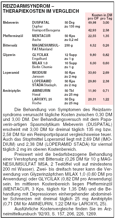Dominieren abdominelle Schmerzen, Bläh- und Spannungsgefühle, können Spasmolytika versucht werden. Setzen die Beschwerden postprandial ein, sind die Medikamente direkt vor den Mahlzeiten einzunehmen.1,2,5 Relevante Unterschiede zwischen Anticholinergika wie Belladonna (BELLADONNYSAT BÜRGER u.a.) oder Dicycloverin (SPASMO-RHOIVAL N), dem peripher wirkenden Spasmolytikum Trimebutin (DEBRIDAT [Schweiz]), direkten Spasmolytika, z.B. Mebeverin (DUSPATAL; a-t 5 [1992], 51), oder Pfefferminzöl (MENTACUR u.a.) sind nicht zu erkennen. Das neuere Cimetropiumbromid (ALGINOR [Italien]) soll "selektiv" am Darm wirken. Ein erster Bericht über einen begrenzten Nutzen auf die Schmerzsymptomatik bedarf der Bestätigung.5