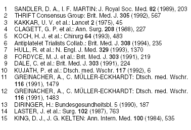• Dextran (MACRODEX) wirkt über mehrere Mechanismen antithrombotisch: Hämodilution, Interferenz mit der Fibrinpolymerisation und über einen antiaggregatorischen Effekt auf Thrombozyten ("Coating"). Der klinische Nutzen zur Prävention der tiefen BVT ist beschränkt. In einer Metaanalyse nehmen tiefe BVT lediglich von 25% auf 17% ab. Lungenembolien scheinen sich hingegen besser verhindern zu lassen, möglicherweise infolge Förderung der Spontanlyse bestehender Thrombosen. Eingeschränkt wird der Nutzen von Dextran durch häufige allergische Störwirkungen, die jedoch durch Vorgabe von Dextran 1 (PROMIT) gemindert werden (a-t 9 [1985], 73).