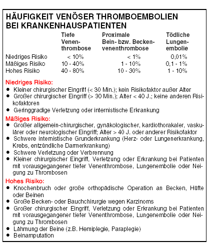 • Mechanische Methoden wie z.B. elastische Kompressionsstrümpfe: Über deren Wirksamkeit gibt es nur spärliche Daten. Nach einer Metaanalyse läßt sich die Häufigkeit tiefer BVT nach allgemeinchirurgischen Eingriffen von 25% auf 9% senken. Durch gleichzeitige Anwendung von Heparin sinkt die Thromboserate auf 6%. Auf eine gute Anpassung der Strümpfe ist zu achten – eine Bedingung, die in der Praxis häufig nicht erreicht wird. Ob sich mit Kompressionsstrümpfen die Letalität bzw. Rate der Lungenembolien verringern läßt, bleibt offen.