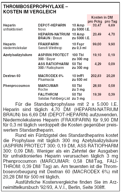 • Der Wert von Azetylsalizylsäure (ASS, ASPIRIN u.a.) zur Prävention tiefer BVT war lange umstritten (s. auch a-t 12 [1988], 109). Die Rate tiefer BVT sinkt von 34% auf 25%, die von Lungenembolien von 3% auf 1% (vgl. a-t 2 [1994], 18).6 ASS kann erwogen werden, wenn Kontraindikationen gegenüber anderen Antikoagulantien bestehen.