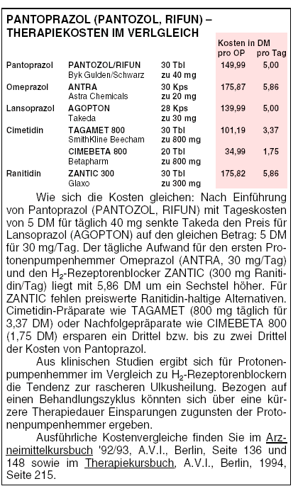FAZIT: Nutzen, Risiken und Kosten des neu eingeführten Omeprazol (ANTRA)-Analogs Pantoprazol (PANTOZOL, RIFUN) entsprechen denen der