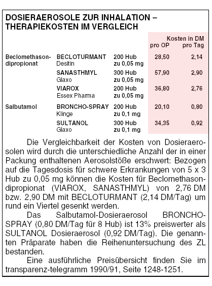 Antiallergika (INTAL, TILADE u.a.), Broncholytika (ALUDRIN, ALUPENT, BEROTEC, PIREM u.a.) bzw. Antiasthmatika (ATROVENT, DUO MEDIHALER,