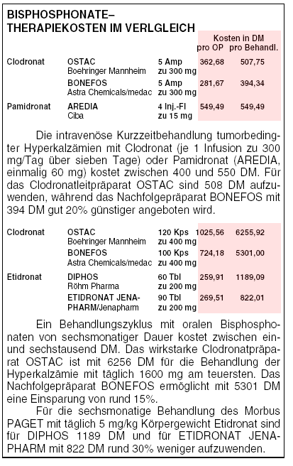 Die wirkstärkeren Bisphosphonate Clodronat (OSTAC, BONEFOS) und Pamidronat (AREDIA) empfehlen sich bei tumorbedingter Hyperkalzämie. Mit