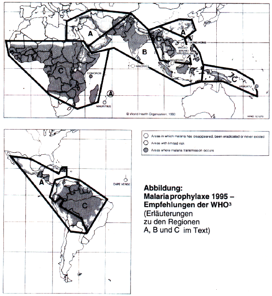falciparum)-Form (in der Abbildung Region A, z.B. Gebiete Mexikos, südöstliche Türkei) genügt die wöchentliche Einnahme von 300 mg