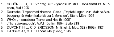 Ausführliche länderbezogene Angaben finden Sie im von uns herausgegebenen Therapiekursbuch4 (s. auch a-t 6 [1993], 57). Im Zweifel hilft der Rat eines Tropeninstitutes weiter.