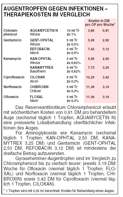 (FUCITHALMIC) verordnet. Die 1991 eingeführten Gyrasehemmer-haltigen Augenzubereitungen FLOXAL (Ofloxacin) und CHIBROXIN (Norfloxacin) nehmen