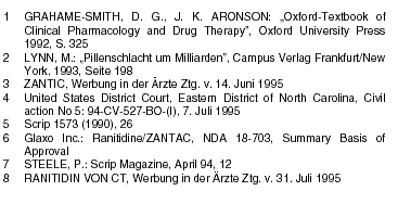Noch beherrschen die 1982 eingeführten Ranitidin-Präparate SOSTRIL und ZANTIC den Markt der H2-Antagonisten mit einem Anteil von etwa 50% und einem Apothekenumsatz in Deutschland von einer halben Milliarde DM. Die Erstanbieter versuchen, ihre Position nach Ablauf des Ranitidin-Basispatentes (Form 1) am 28. Juni dieses Jahres zu halten. Dem Vernehmen nach stellt Glaxo das Originalpräparat meinungsbildenden Kliniken kostenlos zur Verfügung. Als klinisch ausgewiesene Zubereitungen gelten angeblich nur Präparate der Form 2.