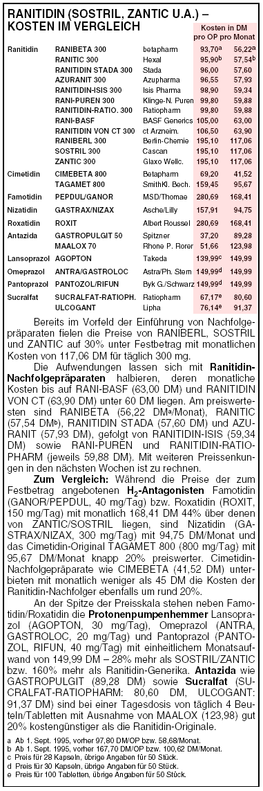 FAZIT: Bereits vor Ablauf des Ranitidin (Form 1)-Basispatentes senkten die Erstanbieter die Preise von SOSTRIL, ZANTIC und RANIBERL auf 30% unter Festbetrag. Mit Nachfolgepräparaten lassen sich inzwischen weitere 50% einsparen (siehe Kasten).
