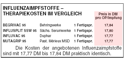 FAZIT: Jedes Jahr ab Oktober/November empfiehlt es sich, gezielt Personen im Rentenalter, chronisch Kranke und andere Gefährdete gegen Influenza zu impfen. Wegen des beim Grippevirus bekannten Antigen-Shifts darf nur der aktuelle Jahrgangsimpfstoff (BEGRIVAC 95 u.a.) verwendet werden. Erkältungen oder "grippalen Infekten" beugt die Impfung nicht vor.