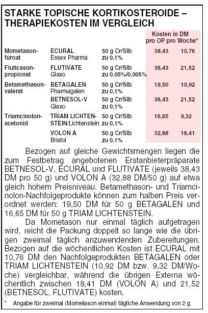 zweimal täglich Betamethasonvalerat 0,1% (BETNESOL-V u.a.) und Triamcinolon 0,1% (VOLON A u.a.) als mindestens gleich wirksam. Schwachen Kortikoiden