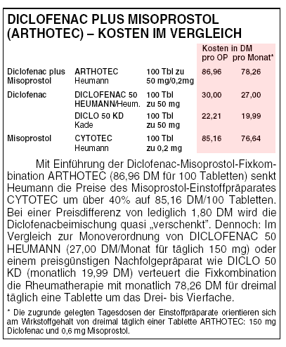 Als "Antirheumatikum mit aktivem Magenschutz" führt Heumann zum 1. September 1995 ARTHOTEC ein, eine Fixkombination aus 50 mg Diclofenac (VOLTAREN u.a.) und 0,2 mg Misoprostol (CYTOTEC). Die Antirheumatika-bedingte unerwünschte Reduzierung des Magenschutzfaktors Prostaglandin E werde durch ARTHOTEC "von vornherein unterdrückt, was die Rheumatherapie sowohl sicherer als auch einfacher macht."1