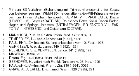 Den Sicherheitsstandard von Blut und Blutprodukten stuft das Bundesgesundheitsministerium als "jetzt vorbildlich" ein. Im dafür zuständigen PAUL-EHRLICH-Institut würden "sämtliche Blutprodukte" überprüft. Die Einrichtung arbeite "problemlos".8 Für bestimmte Bereiche trifft diese Darstellung nicht zu: Der vor drei Jahren erwogene Zulassungsstopp für ausschließlich mit dem Solvent- Detergent-Verfahren behandelte Blutprodukte (a-t 4 [1993], 33) und die vor zwei Jahren vom PAUL-EHRLICH-Institut mit Frist bis 1. Oktober 1995 angemahnte Verbesserung und Validierung der Produktionsmethoden9 wurden bislang nicht verwirklicht. Offensichtlich als verspätete Notlösung will das Institut die Verwendung solcher Faktor-VIII-Präparate jetzt nur noch für Patienten gestatten, die Hepatitis-A- Antikörper besitzen. Fehlt die Immunität, rät die Kontrollbehörde zur Hepatitis-A-Impfung (HAVRIX, VAQTA).3