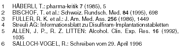 Da der Patient die Einnahme jederzeit unterbrechen kann, lag die Entwicklung von Disulfiram-Implantaten nahe. Dabei werden dem Abhängigen 8 bis 12 Disulfiram-Implantationstabletten zu 100 mg (früher ESPERAL [Frankreich]) zumeist unter die Bauchhaut eingepflanzt. Die Wirkung dieser Dosis, die bei Einnahme per os höchstens eine Woche ausreichen würde, soll mehrere Monate vorhalten.4 Nach Alkoholgenuß liegen die Azetaldehydspiegel kaum höher als unter Plazebo und reichen nicht aus, um die erwünschte Unverträglichkeitsreaktion hervorzurufen.5 Wie von Schwedens Arzneibehörde bereits 1980 vermutet (a-t 11 [1980], 93), kommt allenfalls der Suggestivwirkung des Verfahrens Bedeutung zu.5 Deutsche Experten haben die "sinnlose, nicht ungefährliche" Prozedur vor etwa 15 Jahren aufgegeben.6