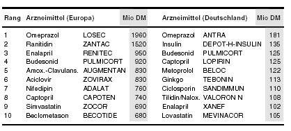(BECOTIDE, SANASTHMAX u.a.) drei Produkte unter den europäischen Top 10, Astra mit ANTRA/LOSEC und PULMICORT sowie Merck & Co. mit Enalapril