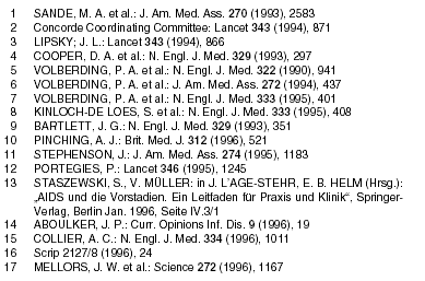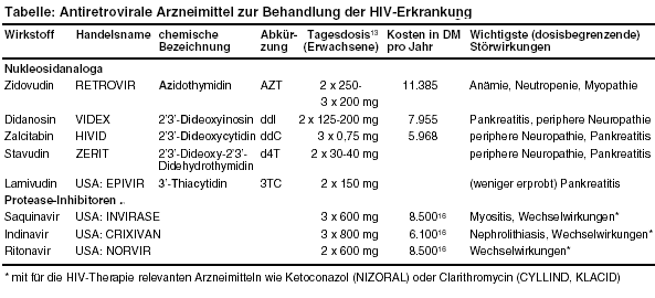 FAZIT: Die antiretrovirale Therapie der HIV-Infektion beginnt heute mit einer Kombination von zwei Nukleosidanaloga. Hierzulande stehen Zidovudin (AZT, RETROVIR), Zalcitabin (ddC, HIVID) und Didanosin (ddI, VIDEX), seit Mai auch Stavudin (d4T, ZERIT) zur Verfügung. Das älteste AIDS-Mittel Zidovudin ist als liquorgängigstes zentraler Baustein von Mehrfachschemata, alternativ bietet sich Stavudin an. Ein optimaler Zeitpunkt für den Therapiebeginn läßt sich derzeit nicht angeben. Hoffnungen knüpfen sich an Proteasehemmer als potente antiretrovirale Medikamente. Es bleibt zu wünschen, daß sich die überlegene Reduzierung der Virusbeladung in klinischen Erfolgen niederschlägt.