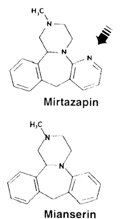 abgesehen von einem zusätzlichen Stickstoffatom (vgl. Abbildung) dem ebenfalls von Organon angebotenen Mianserin (TOLVIN u.a.). Mit 30 mg/Tag