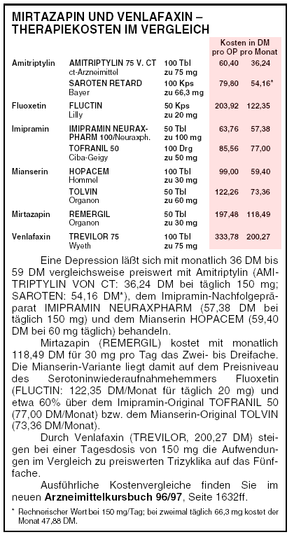 einigen Wochen versprechen Wyeth für Venlafaxin (TREVILOR; "neue Klasse der Antidepressiva")1 und Organon für Mirtazapin