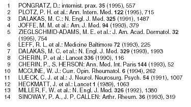 Plasmaaustausch oder Lymphozytenentzug bleiben in einer plazebokontrollierten Studie ohne Einfluß auf Muskelkraft und -funktion von Patienten mit steroidresistenter Poly- und Dermatomyositis.13 Bei besonders ungünstigen prognostischen Umständen, z.B. Lungenbeteiligung und positive Antisynthetase-Antikörper, kann im Ausnahmefall eine hochdosierte intravenöse Cyclophosphamid (ENDOXAN u.a.)-Therapie sinnvoll sein, oder, z.B. bei Einschlußkörper-Myositis mit hoher Krankheitsaktivität, ein Kortikoid zusammen mit den Alkylantien Cyclophosphamid per os oder Chlorambucil (LEUKERAN).2,14