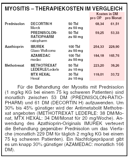 FAZIT: Die "idiopathischen" Muskelentzündungen gehören zu den seltenen Autoimmunerkrankungen. Mittel der Wahl sind Glukokortikoide wie Prednisolon (DECORTIN H u.a.). Versagen diese, kommen das Immunsuppressivum Azathioprin (IMUREK u.a.) oder der Antimetabolit Methotrexat (METHOTREXAT LEDERLE u.a.) in Betracht. Inwieweit das Alkylans Cyclophosphamid (ENDOXAN u.a.), das Immunsuppressivum Ciclosporin A (SANDIMMUN) und intravenöse Immunglobuline (SANDOGLOBULIN u.a.) relevanten Nutzen bringen, bleibt zu erforschen.