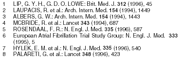 FAZIT: Abhängig von Alter und Begleiterkrankungen läßt sich das Risiko von Schlaganfällen bei Patienten mit nicht-rheumatischem Vorhofflimmern mit Azetylsalizylsäure (ASPIRIN u.a.) bzw. oralen Antikoagulantien deutlich senken. INR-Werte zwischen 2 und 3 sind anzustreben.