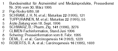FAZIT: Schering bringt mit CLIMEN eine Östrogen-Antiandrogen-Kombination zur Behandlung von Beschwerden in den Wechseljahren in den Handel, für deren Cyproteronazetat-Bestandteil in-vitro- und in-vivo-Daten Hinweise auf Kanzerogenität geben. Bei Arzneimitteln, die jahre- bis jahrzehntelang eingenommen werden, halten wir es für nicht vertretbar, die klinische Bedeutung solcher Befunde als "ungewiß" zu verharmlosen. Die Zulassung von CLIMEN mit breiter Indikation widerspricht dem Gebot des vorbeugenden Verbraucherschutzes.