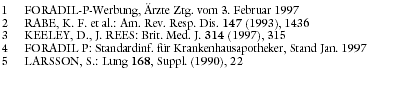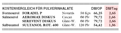FORADIL P kommt mit Tageskosten von 2,65 DM für zwei Inhalationen praktisch zum gleichen Preis auf den Markt wie Salmeterol (AEROMAX, SEREVENT DISKUS [2,66 DM/Tag]) und fast doppelt so teuer wie dreimal täglich 0,4 mg Salbutamol (SULTANOL ROTADISK 400, 1,36 DM/Tag):