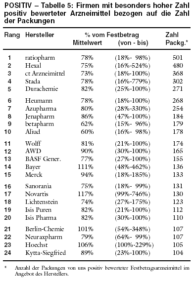 Fünf Firmen bieten eine Produktpalette an, deren Preisdurchschnitt über dem Festbetrag liegt (Tabelle 1) :