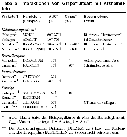 Grapefruit - ein besonderer Saft: Ein einziges Glas Grapefruitsaft kann die Bioverfügbarkeit vieler eingenommener Arzneimittel deutlich steigern. Betroffen sind vorwiegend Substanzen mit geringer Bioverfügbarkeit wie Kalziumantagonisten, das Antiallergikum Terfenadin (TELDANE u.a., vgl. a-t 5 [1997], 57; 1 [1997], 16) und das Immunsuppressivum Ciclosporin (SANDIMMUN, siehe Tabelle). Entdeckt wurde die Wechselwirkung eher zufällig, als das bitter-herbe Getränk in klinischen Studien als geschmacküberdeckendes Vehikel diente. Überlegungen, die Wirkspiegel teurer Mittel wie Ciclosporin durch "Komedikation" von Pampelmusensaft zu erhöhen, um deren Dosis verringern und Kosten einsparen zu können, scheitern an der fehlenden Standardisierung des Getränks (a-t 7 [1996], 65). Bestandteile des Grapefruitsafts wie der Metabolit des in großen Mengen enthaltenen Bioflavonoids Naringin hemmen Enzyme der Zytochrom-P450-Gruppe in der Darmwand (CYP3A4, CYP1A2). Diese bauen viele Substanzen zum Teil bereits im Darm ab, bevor sie überhaupt absorbiert und systemisch wirksam werden können. Das Ausmaß der Interaktion schwankt von Person zu Person stark. Für den Kalziumantagonisten Felodipin (MODIP u.a.) entspricht der Effekt etwa den durch Wechselwirkung mit Erythromycin (ERYTHROCIN u.a.) beobachteten Konzentrationsveränderungen. Zytochrom P450 in der Leber scheint allerdings - wenn überhaupt - nur gering beeinflusst zu werden. Ob andere Substrate von CYP3A4 wie Cholesterinsynthesehemmer (z.B. Lovastatin [MEVINACOR]) und das Prokinetikum Cisaprid (PROPULSIN u.a.) ebenfalls betroffen sind, ist bislang nicht untersucht. Der Effekt einer einzelnen "Dosis" Saft hält möglicherweise länger als einen Tag an. Empfehlungen, eine Stunde vor und nach Einnahme betroffener Arzneimittel auf Grapefruit zu verzichten, greifen dann zu kurz. Einige Autoren raten zu Beständigkeit: Wer regelmäßig oder nie Grapefruitsaft trinkt, habe wenig zu befürchten. Problematisch sei dagegen gelegentlicher Konsum (SPENCE, J. D.: Clin. Pharmacol. Ther. 61 [1997], 395; MORRIS, K.: Lancet 349 [1997], 1524; Prescr. Update 14 [1997], 18; BAILEY, D. G. et al.: Clin. Pharmacol. Ther. 60 [1996], 25).