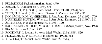 Nach einer lückenhaft veröffentlichten plazebokontrollierten Vergleichstudie sollen bis zu 1.290 mg Fumarsäureester-Gemisch täglich Psoriasis- Läsionen bei der Hälfte der Patienten um mindestens 70% bessern. Bei jedem Zehnten verschlechtert sich die Schuppenflechte.3 Trotz einschleichender Dosierung klagen drei von vier Kranken über Störwirkungen. Diese sind neben mangelnder Wirksamkeit Hauptgrund für vorzeitiges Ausscheiden von 40% der Teilnehmer. Eine gelungene Verblindung erscheint uns unwahrscheinlich. Die Daten der Studie halten wir für widersprüchlich und praktisch nicht auswertbar: Mehr Patienten haben anscheinend Besserung erfahren, als nach Abzug von Studienabbrechern und Nonrespondern in der Studie verbleiben. Weitere, zumeist kleine offene Studien4,5,6 bringen ebenfalls wenig überzeugende Ergebnisse. Vergleiche mit anderen Antipsoriatika fehlen.