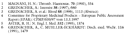 bestehen und eine parenterale Antikoagulation benötigt wird. Damit gibt es eine Alternative zum Heparinoid Danaparoid (Niederlande: ORGARAN; a-t 8 [1995], 85), unter dem sich die Thrombozytenzahl bei HIT II zu etwa 90% normalisiert und das eine wirksame