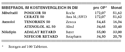 KOSTEN: Mibefradil verteuert die Behandlung des Bluthochdrucks und der Angina pectoris mit monatlichen Kosten von 52 DM für täglich 50 mg gegenüber einem Erstwahlmittel wie Atenolol um das Drei- bis Fünffache (TENORMIN monatlich 16 DM, ATENOLOL AL monatlich 10 DM für täglich 50 mg), gegenüber retardiertem Nifedipin um das 11/2- bis 21/2-fache (ADALAT RETARD monatlich 33 DM, NIFECOR RETARD monatlich 21 DM für täglich 40 mg).