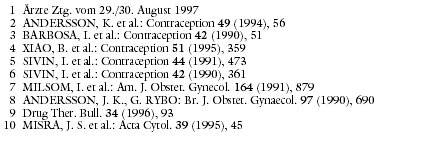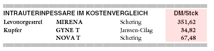 KOSTEN: Mit 350 DM kostet MIRENA das Fünf- bis Zehnfache von kupferhaltigen Spiralen (35 DM bis 67 DM) und knapp die Hälfte der