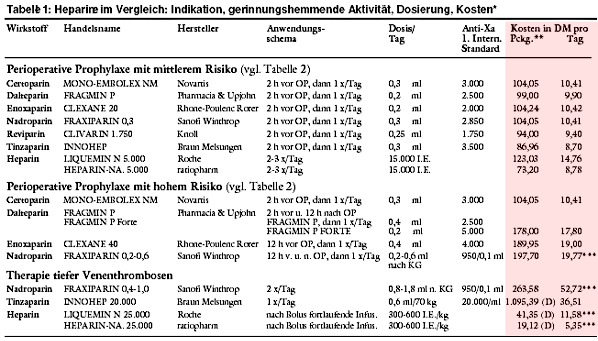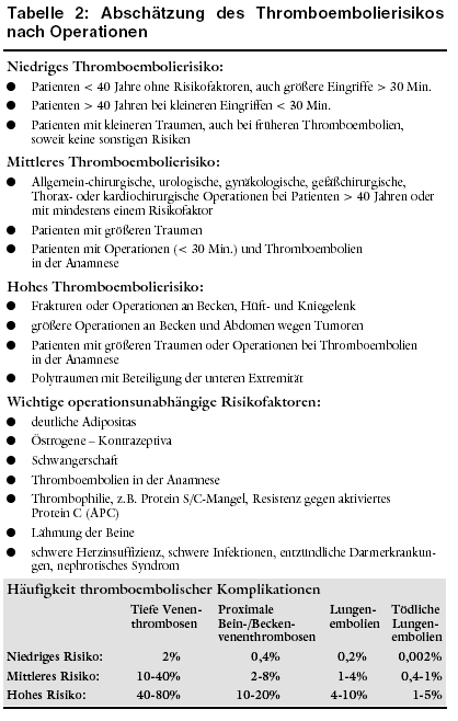 zur Verfügung. Für die perioperative Prophylaxe mit hohem Thromboembolierisiko sind niedermolekulare Heparine heute Mittel der Wahl. Bei mittlerem