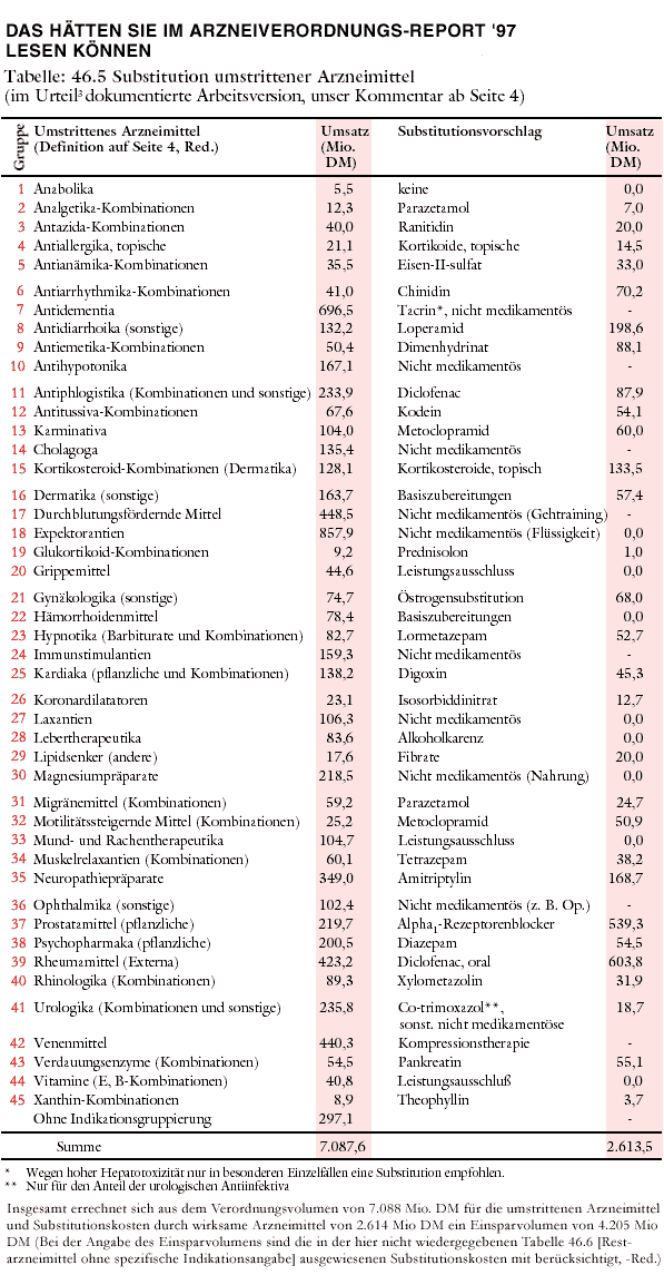 Im Urteilstatbestand folgt auf Seite 4 die Tabelle 46.5 "Substitution umstrittener Arzneimittel" (siehe Tabelle). Da es sich hierbei um eine frühe