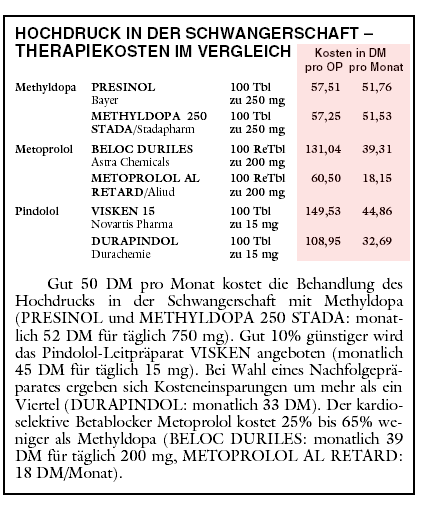 FAZIT: In der Hochdruckbehandlung Schwangerer werden zwei ansonsten wenig gebräuchliche Altarzneimittel bevorzugt: Methyldopa (PRESINOL u.a.)