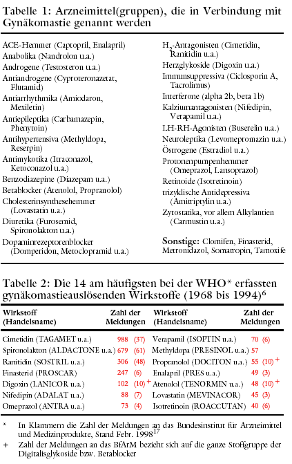 innerhalb von 27 Jahren (1968 bis 1994) gemeldeten Verdachtsberichte zur arzneibedingten Gynäkomastie (Tabelle 2). Cimetidin soll Androgene von ihren