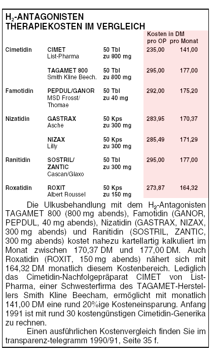 Die beiden Ranitidin-Präparate SOSTRIL und ZANTIC führten auch 1989 mit leicht steigender Tendenz den Markt der Ulkusmittel an, gefolgt vom Famotidin-Präparat PEPDUL und dem ältesten H2-Antagonisten Cimetidin (TAGAMET), der weiterhin in der Gunst der Verordner sinkt. Die beiden neuen Nizatidin-Präparate GASTRAX und NIZAX etablierten sich ebenfalls unter den 2000 meist verordneten Präparaten.1