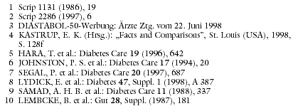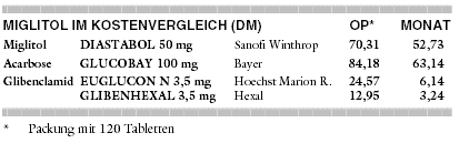 KOSTEN: Der zweite Alpha-Glukosidasehemmer Miglitol (DIASTABOL) wird mit monatlich 53 DM für täglich 150 mg 15% günstiger angeboten als der Vorläufer Acarbose (GLUCOBAY: 63 DM/Monat für täglich 300 mg). Er verteuert die Diabetestherapie gegenüber Glibenclamid um das Acht- bis Sechzehnfache (EUGLUCON N: 6 DM/Monat, GLIBENHEXAL 3 DM/Monat für täglich 3,5 mg).