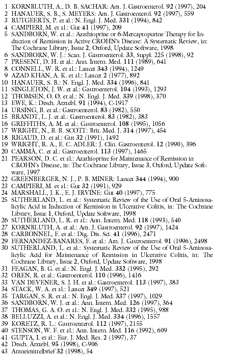EXPERIMENTELLE THERAPIE: Als Alternative zu Azathioprin und 6-Mercaptopurin wird der Folsäureantagonist Methotrexat (LANTAREL u.a.) untersucht. Viermonatige Therapie mit 25 mg Methotrexat i.m. pro Woche bewirkt bei 39% steroidabhängiger Patienten mit chronisch aktivem Morbus CROHN eine Remission und senkt den Steroidverbrauch.31 17% brechen die Studie wegen Störwirkungen ab. Methotrexat ruft Magen-Darm- Störungen hervor, schädigt Leber und Knochenmark und kann eine Pneumonitis auslösen. Der Folsäureantagonist kann bei M. CROHN als "Therapieversuch" verwendet werden, wenn Azathioprin oder 6-Mercaptopurin versagen oder nicht vertragen werden. In der einzigen publizierten randomisierten Studie bei Colitis ulcerosa schneiden wöchentlich 12,5 mg Methotrexat per os nicht besser ab als Plazebo.32