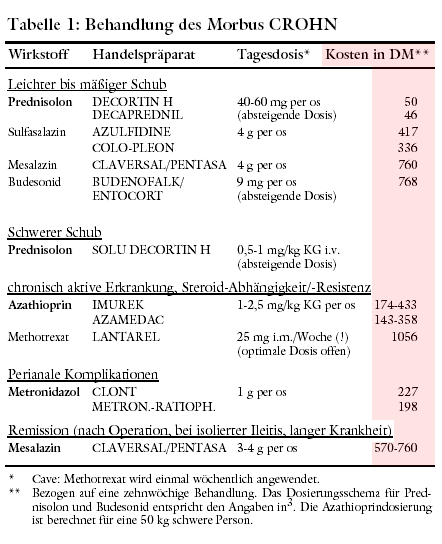 FAZIT: Chronisch entzündliche Darmerkrankungen haben in den letzten Jahrzehnten zugenommen. Im akuten Schub des Morbus CROHN sind nach wie vor systemische Kortikosteroide wie Prednisolon (DECORTIN H u.a.) Mittel der Wahl. Bei mäßiger Ausprägung und Steroidunverträglichkeit kommen Aminosalizylate wie Mesalazin (PENTASA u.a.) in Betracht, wenn die Erkrankung auf terminales Ileum und aufsteigendes Kolon beschränkt ist und keine systemischen Komplikationen vorliegen, auch das topische Reserve-Steroid Budesonid (BUDENOFALK, ENTOCORT).