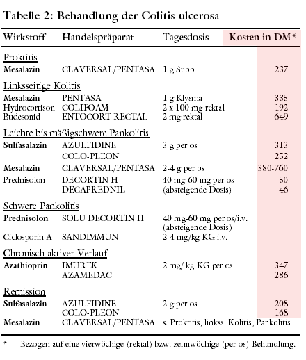 Aminosalizylate wirken bei Colitis ulcerosa besser als bei M. CROHN, sowohl bei aktiver Erkrankung als auch zur Vorbeugung von Rückfällen. Für die distale Kolitis werden in erster Linie topische Zubereitungen empfohlen. Kortikosteroide und gegebenenfalls Ciclosporin A (SANDIMMUN) kommen bei schweren Verläufen zur Anwendung.