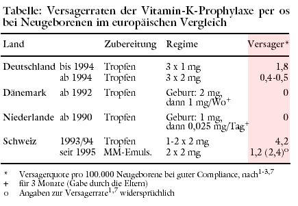 Seit Bekanntwerden des Krebsverdachts in Verbindung mit Vitamin K i.m. (siehe Kasten) werden in vielen Ländern orale Prophylaxe-Regime empfohlen. Unter der zunächst in Deutschland sowie in Australien üblichen dreimaligen oralen Dosis von 1 mg (KONAKION N) finden sich 1,8 späte Vitamin-K- Mangelblutungen pro 100.000 Neugeborene. Zuverlässig beugen dagegen offenbar das dänische und das niederländische Schema mit häufigeren Einzeldosierungen vor (siehe Tabelle). Bei guter Compliance sind bisher keine Prophylaxeversager bekannt.1,2