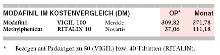 KOSTEN: Verglichen mit täglich 40 mg Methylphenidat (RITALIN; 111 DM/Monat) verteuert Modafinil in der niedrigen 200-mg-Dosis die Behandlung