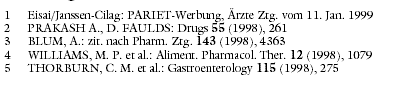FAZIT: Der neue Protonenpumpenhemmer Rabeprazol (PARIET) soll besonders rasch wirken - eine zu Marketing-Zwecken hervorgehobene in-vitro- Eigenschaft, deren klinischer Nutzen nicht belegt ist. Auf Grund potentieller Blockierung anderer Enzyme im Organismus lassen sich besondere Schadeffekte nicht ausschließen. Der im Vergleich zu Omeprazol (ANTRA u.a.) etwas günstigere Preis kann die möglichen Risiken der Pseudoinnovation nicht ausgleichen.