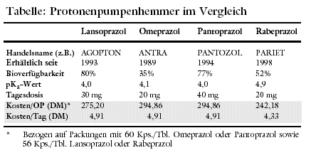 Rabeprazol kostet in der empfohlenden Tagesdosis von 20 mg mit 4,33 DM gut 10% weniger als täglich 20 mg Omeprazol (4,91 DM) - siehe Tabelle.