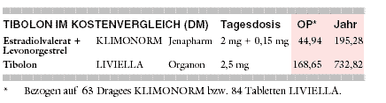 KOSTEN: Täglich eine Tablette Tibolon (LIVIELLA) zu 2,5 mg kostet mit 733 DM pro Jahr fast das Vierfache einer Östrogen-Gestagen-