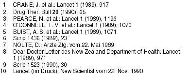Der Verdacht, die Verwendung von Asthmadosieraerosolen könne die Mortalität Asthmakranker erhöhen, stammt aus den 60er Jahren (vgl. a-t 8 [1972], 34). Ende der 70er Jahre nahm in Neuseeland nach Einführung des Fenoterol (BEROTEC)-Dosieraerosols die Zahl von Asthmatodesfällen zu. Die Hälfte der Verstorbenen verwendete Fenoterol-Dosieraerosole. Damit lag die Zahl der Todesfälle doppelt so hoch wie erwartet, da dieser Wirkstoff im Erhebungszeitraum nur einen Marktanteil von einem Viertel hatte. Eine Fallkontrollstudie an über 100 in einem Zweijahreszeitraum in Neuseeland verstorbenen Asthmapatienten zwischen 5 und 45 Jahren und 468 Kontrollpatienten stützt die Hypothese eines Zusammenhangs von Fenoterol-Anwendung und Zunahme der Sterblichkeit.1
