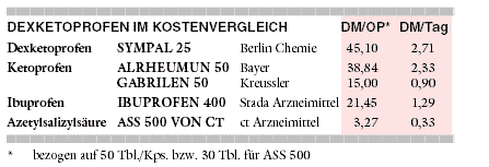 Dexketoprofen (SYMPAL) kostet bei einer Tagesdosis von 75 mg 2,71 DM und damit 16% bis 200% mehr Ketoprofen (ALRHEUMUN: 2,33 DM für 150 mg, GABRILEN: 0,90 DM) und 110% mehr als 1.200 mg Ibuprofen (IBUPROFEN 400 STADA: 1,29 DM). Gegenüber preiswerten Azetylsalizylsäure- Präparaten (ASS 500 VON CT; 0,33 DM für 1.500 mg) verteuert SYMPAL die Behandlung sogar um das Siebenfache.